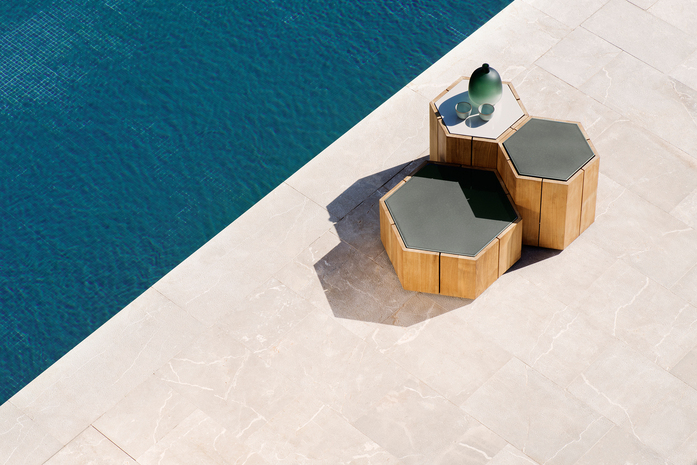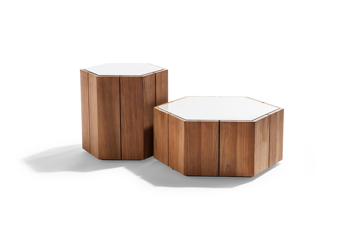Marc Merckx’s Hexagon tables prove that nature is an inexhaustible source of inspiration for new designs. The designer looked for and found his inspiration in the Giant’s Causeway. It’s a rock formation in Northern Ireland that was declared a UNESCO World Heritage Site. The table’s teak support refers to the hexagonal basalt pillars from this natural wonder. Moreover, Merckx swears by sophisticated proportions, which is why the perfect symmetry of the honeycomb was his second source of inspiration. The Hexagon tabletop is made from glazed lava rock with a craquelure effect that highlights the natural imperfections in the stone. The enamel layer makes the natural rock water, heat, frost, UV, and stain-resistant. Hexagon is equally beautiful on its own or in a multiunit layout.