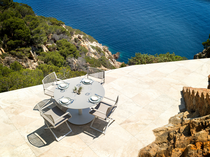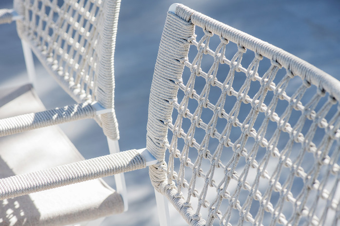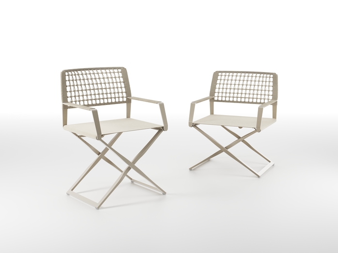 The lattice back rest has the look and natural texture of rope and is handwoven using an innovative weather resistant fibre, also used to cover the armrests. The powdercoated frame is composed of innovative composite materials to give it extra strength. An invisible mechanism allows the armrest and the backrest support to be adjusted in a controlled manner. REGISTA is a sophisticated reinvention of a design icon, a classic addition to Tribù’s stylish outdoor world.