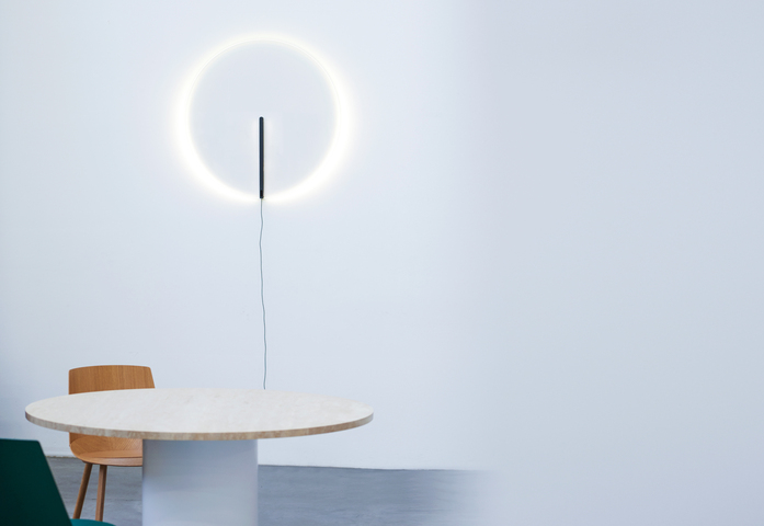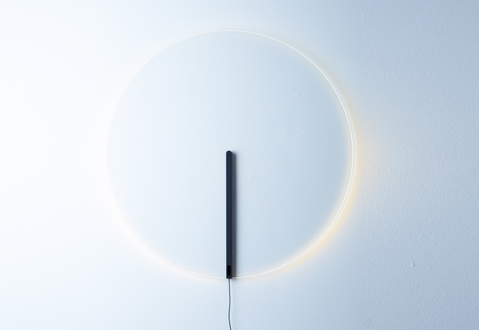 With Guise Stefan Diez has discovered a new potential use for LED technology in contact with matter: The light emanates from the piece of glass, while the source remains invisible. With this approach Guise achieves a magical effect and at the same time is fully functional. Because of the transparency of the glass when switched off the lamp almost disappears. When switched on it expresses a luminous and almost magnetic presence. The wall sconce version with a different formal expression features a glass disk that gives off a perimeter glow where the Led light source is also hidden. When turned off it becomes fused with its background, when on it evokes a solar eclipse.