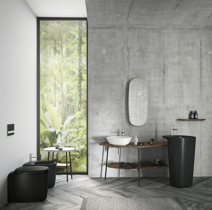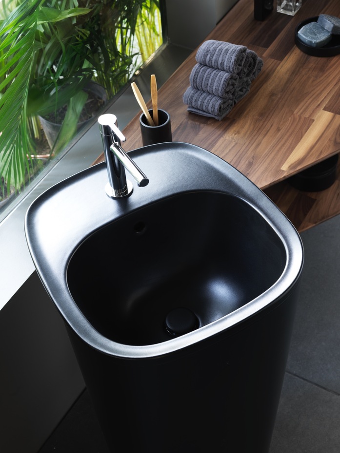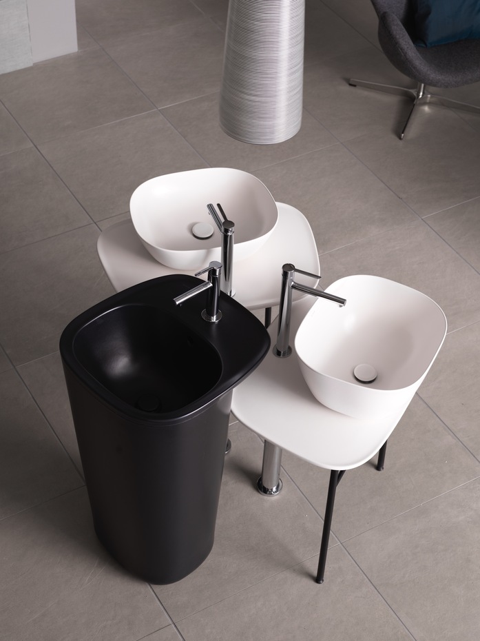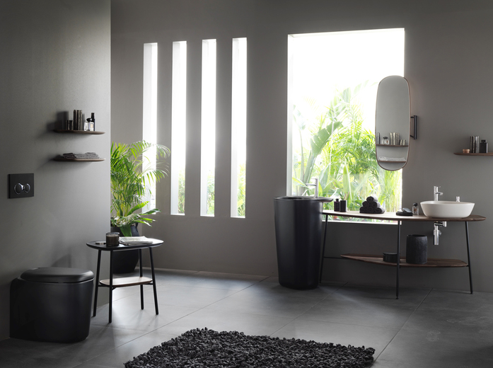 The collection introduces three innovative syphon solutions - one allows the ceramic basins to be placed at various angles as an alternative to the conventional positioning by the wall, encouraging users to face each other and engage with their surroundings. Another has been designed specifically to enable washbasins to be mounted in an open bathroom space while retaining a clean and minimalistic look. The third allows for the fitting of column basins at free angles in the room instead of the more common 90° angle to the wall.