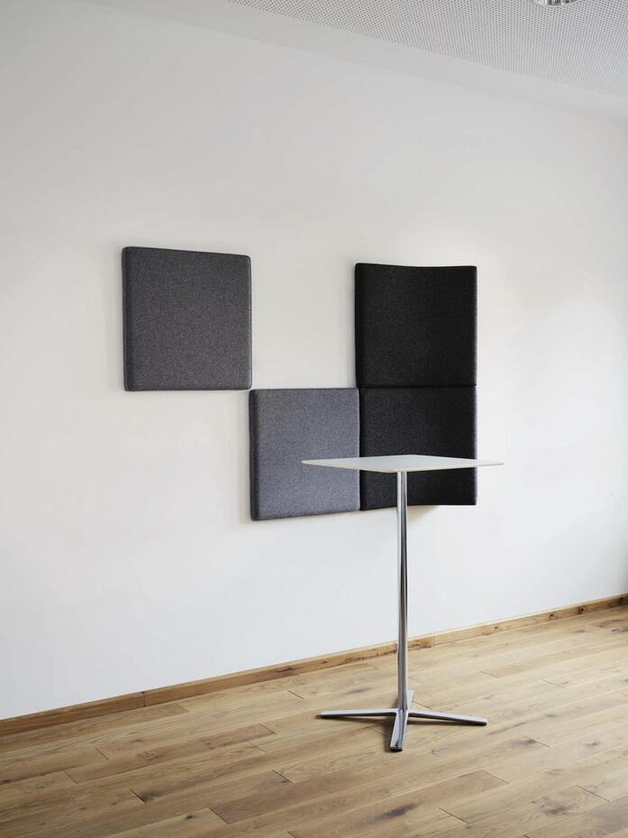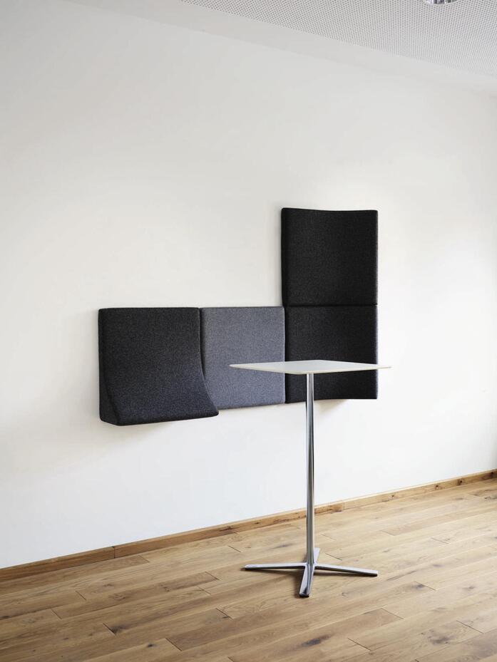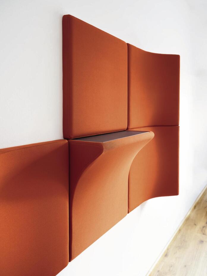 In the case of the Landing wall option, the name says it all. It manages to create a welcoming atmosphere for “stopovers” in aisles, cross-over spaces and stairwells where space is lacking for groups of seating and side tables. Landing consists of two basic sound-absorbent modules: a flat one 60 x 60 cm in size with an element upholstered with 10-mm-thick foam and covered in fabric and an equally large three-dimensional moulded relief element that can be used in three ways depending on the way it’s fitted: as a shelf (with an additional powder-coated steel surface), rotated vertically by 90° as an upright method of creating a zone, providing a screen or a cosy corner for leaning on and turned 180° horizontally to perch on. The modules are placed in assembly frames and can be used in any number of combinations. They improve acoustics, create little corners for chats or phone calls, offer spaces to leave drinks or smartphones and take the strain off people’s feet. The covers come in seven standard colours to tap into more design options and allow Landing to be used as colour-coded signage systems.