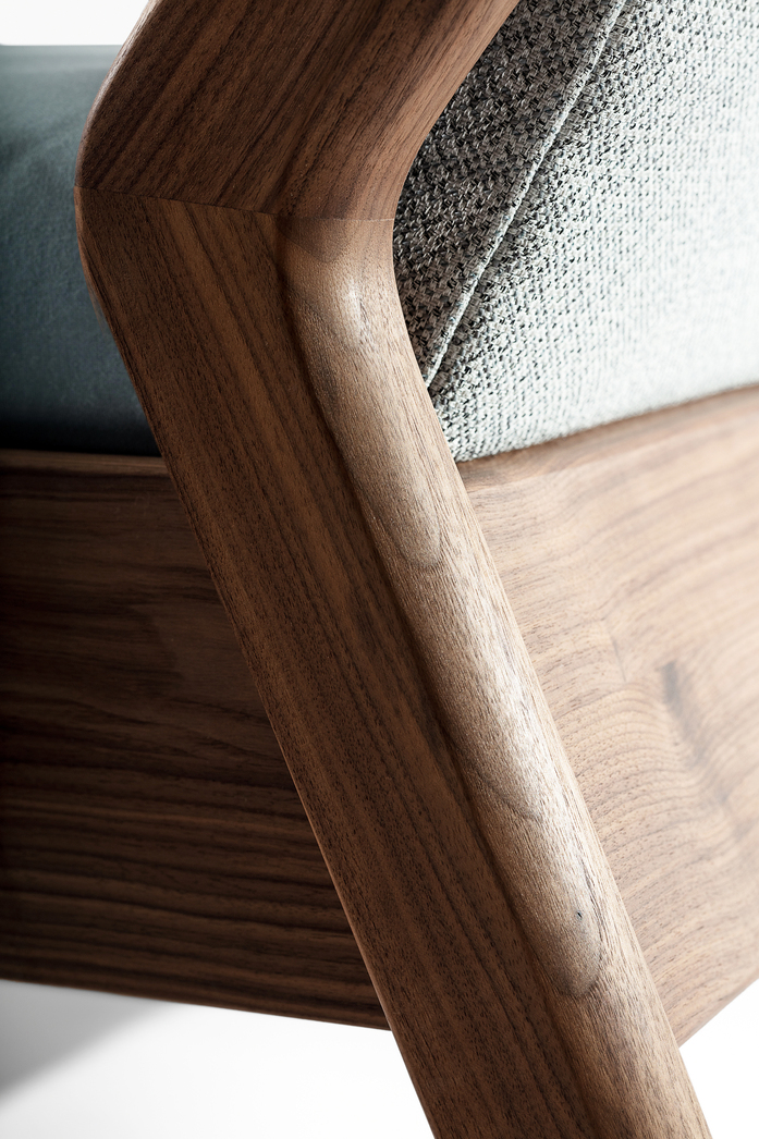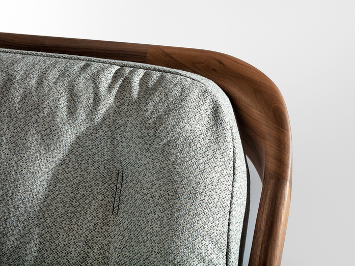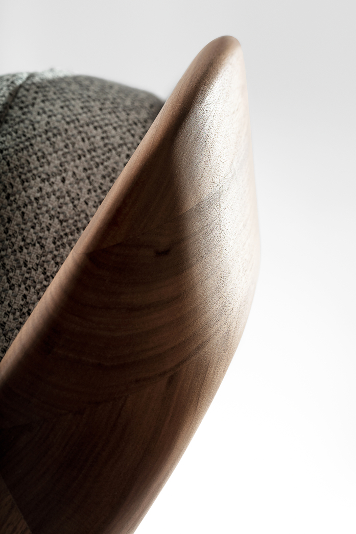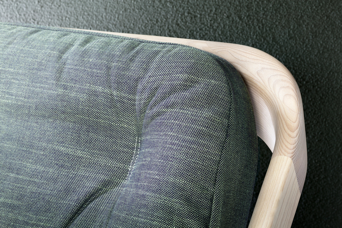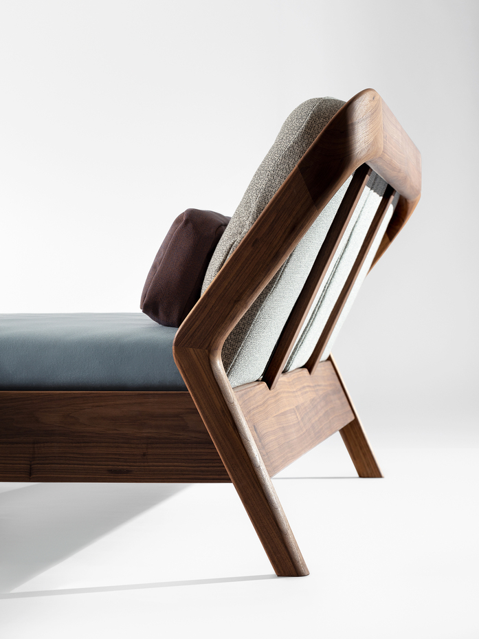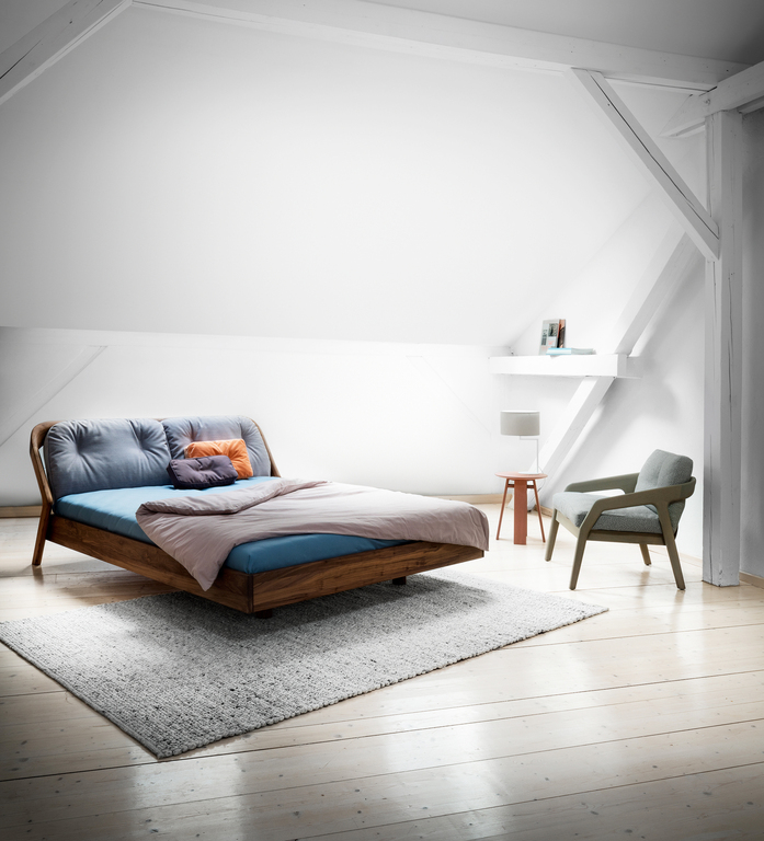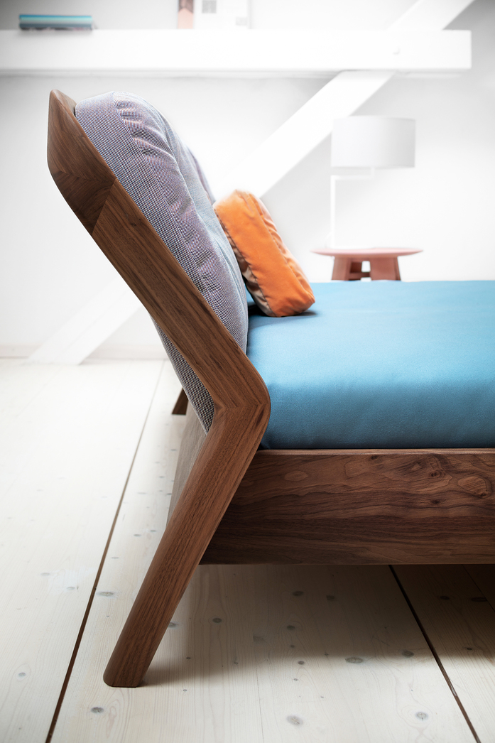 The backrest swings in a gentle arc from the headboard down to the ground. Midway, the elegance of the shape changes – it makes an unforeseen bend and the graceful back becomes a solid foot of the bed. The whole back looks like one piece and despite its solidity, it radiates a casual rest. In contrary, the front part of the bed seems to float in the air, due to the inwardly offset feet.