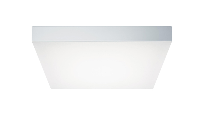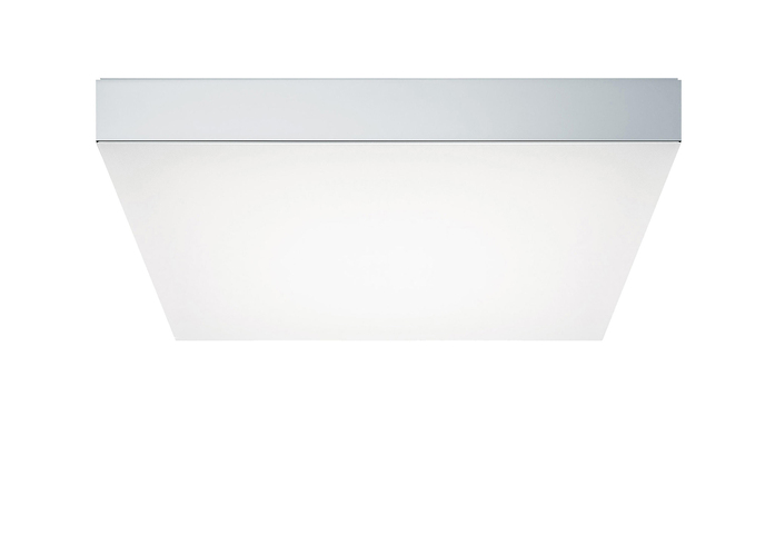Diffuse LED surface-mounted luminaire as LED light ceiling module with acoustically effective double textile optic. Single light modules are simple to open in clusters. The frameless optic has a uniform ceiling appearance when arranged in clusters with only a minimum gaps for perfect architectural appearances. The high quality architectural textiles from SEFAR are flame-retardant and comply with requisite fire regulations for indoor use (DIN 4102-1 B1 / EN ISO 13501-1 B-s1).